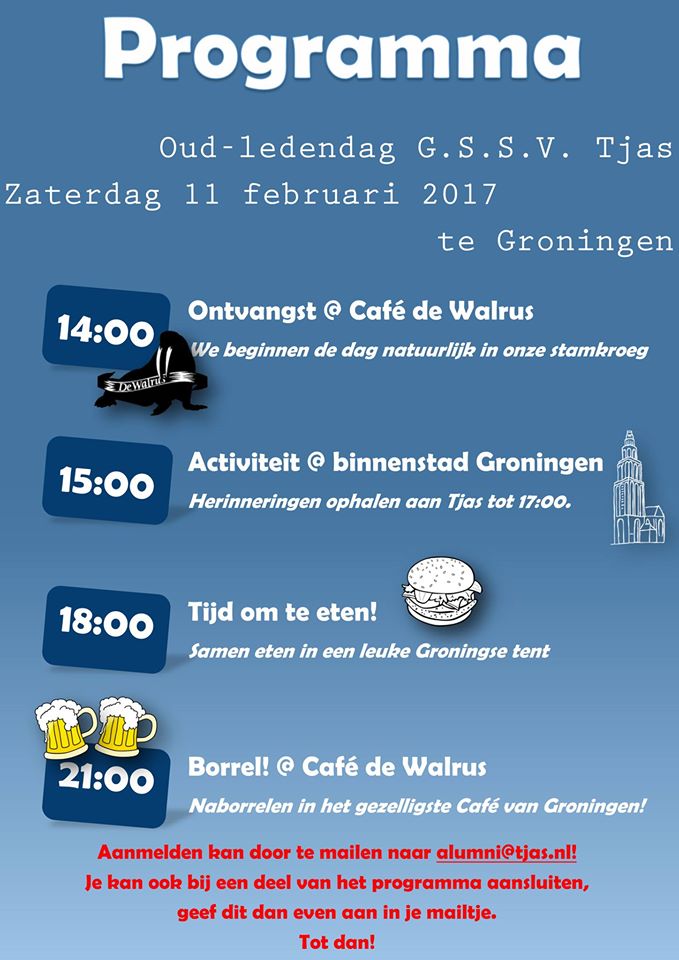 De activiteit wordt georganiseerd door een aantal oud-leden en huidige leden van Tjas die deze dag een leuke invulling gaan geven. Lijkt het je leuk om hier bij te zijn, reserveer deze dag dan vast in je agenda! De dag zal beginnen rond 14:00 uur in Groningen en zal na een aantal leuke activiteiten eindigen met een borrel in Café de Walrus. Uiteraard kan je ook bij een deel van de activiteiten aanwezig zijn. In de bijlage is het volledige programma te vinden.